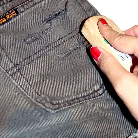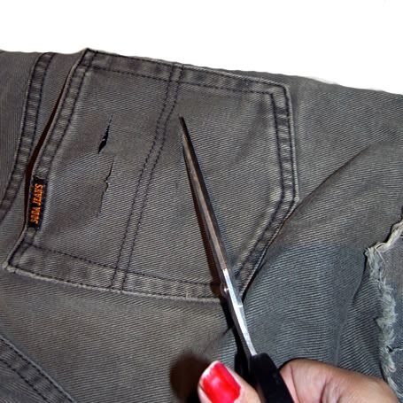 - Coloque los pantalones vaqueros plano hacia abajo y empezar a cortar o hacer pequeñas incisiones en